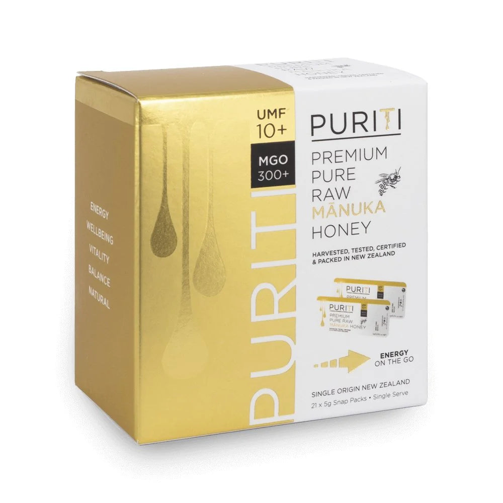 Genuine PURITI Manuka Honey Snap Packs are independently certified for UMF™ 10+ and MGO 300+. Featuring 21 individual snap packs per box, these are an ideal alternative to refined sugar and a more balanced energy release - the perfect travelling companion filled with a single serving of premium-grade Manuka honey.